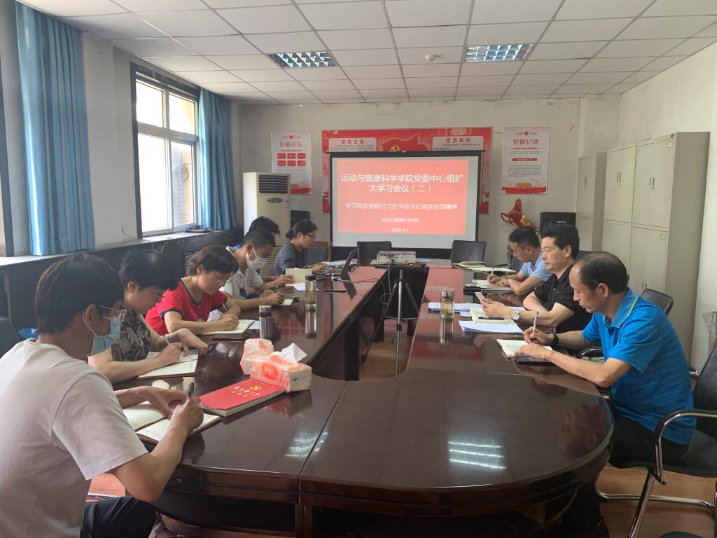 2020年6月4日,运动与健康科学学院在实验楼五楼会议室召开学院党委中心组扩大学习会议(二)—— 学习和交流研讨习近平总书记来陕讲话重要精神。运动与健康科学学院领导班子成员、各支部书记参会。