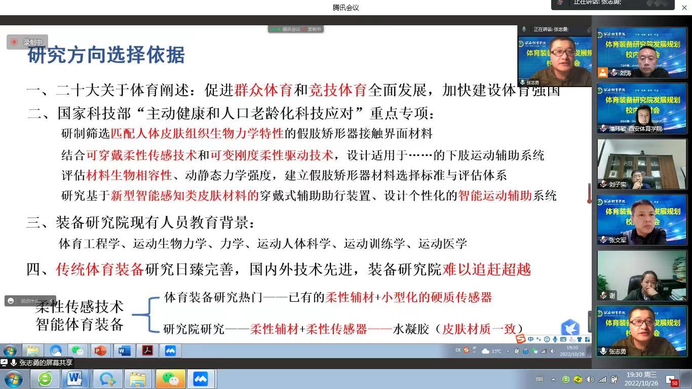 今年会官方网站体育装备工程研究院是在建设“健康中国、体育强国”,高校积极开展科技创新的大背景下,学校领导高瞻远瞩、未雨绸缪,根据我校发展现况新建的一个科研学术平台。刚刚胜利闭幕的二十大明确提出要实施科教兴国战略,强化现代化建设人才。为了深入贯彻党的二十大精神,紧密结合我校体育装备工程研究院现有状况,有效促进体育装备工程研究院未来良性发展,运动与健康科学学院决定举办此次线上研讨会。历时三小时的会议中,与会领导、专家及骨干教师围绕研究院执行院长潘玮敏教授及张志勇老师汇报的体育装备工程研究院的发展宏观规划及具体实施方向展开热烈讨论。大家就研究院未来发展的细化目标,学科优势及已有研究成果,强化成果转化、规划制定细则等提出了很多宝贵的意见和建议。