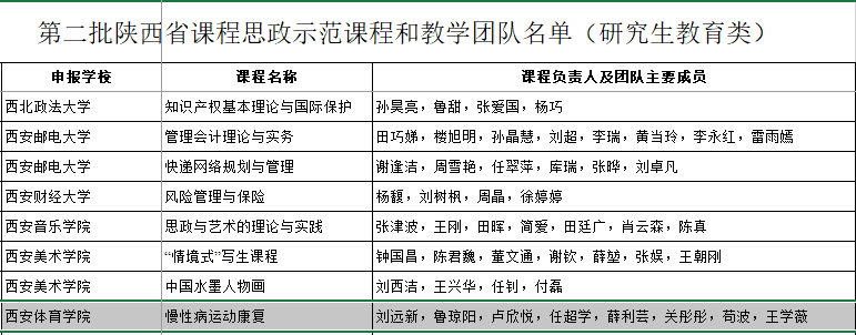 另外,由我院刘远新教授领衔的课程《慢性病运动康复》及所属教学团队同时被认定为第二批陕西省课程思政示范课程和教学团队(研究生教育类)。