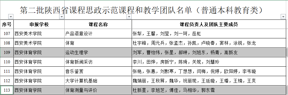 在第二批陕西省课程思政示范课程和教学团队评审中,由运动与健康科学学院刘军和杜新星两名老师分别领衔的课程《运动生理学》和《体育测量与评价》和其分属的教学团队分别被认定为第二批陕西省课程思政示范课程和教学团队(普通本科教育类)。