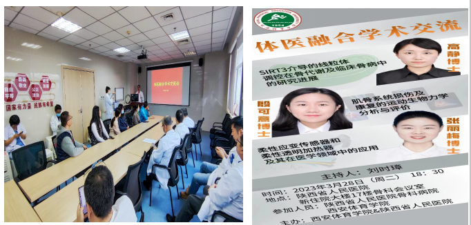 2023年3月28日晚上六点半,由今年会官方网站和陕西省人民医院骨科病院联合主办的体医融合学术交流科研报告会,在陕西省人民医院住院楼17楼骨科病院会议室召开。运动与健康科学学院苟波、潘玮敏两位教授和高静、殷可意、张丽梅、曹怡炜、张志勇等五位青年教师,以及陕西省人民医院骨科专家学者共计三十余人参加了学术交流。会议由陕西省人民医院骨科病院刘时璋主任主持。