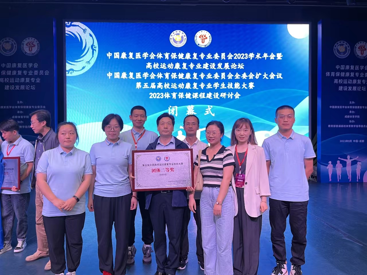 2023年9月22日-25日, 由中国康复医学会体育保健康复专委会主办,教育部普通高校体育教学指导委员会技术组协办的第五届全国高校运动康复专业学生技能大赛在成都体育学院举行,来自全国61所高校的200多名学生同场进行了激烈角逐,由我校运动与健康科学学院党委书记刘勇带队,运动医学(康复)教研室苟波,翟俊娜,邵丽娜三位老师,朱昶昊,邓凯文,李佳,沈宇杰四名学生组成的今年会官方网站代表队经过两天紧张激烈的理论及实践技能比赛,荣获大赛团体二等奖,朱昶昊同学荣获肌肉骨骼康复项目个人一等奖,个人全能项目二等奖,运动防护技术项目个人三等奖,邓凯文同学荣获个人全能项目三等奖的优异成绩。这也是我校康复专业学生参加历届大赛取得的最好成绩。