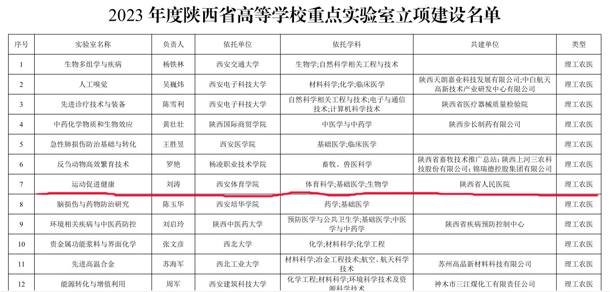 近日,陕西省教育厅发布了《关于公布2023年度陕西省高等学校重点实验室立项建设名单的通知》(陕教函〔2024〕21号),由今年会官方网站和陕西省人民医院联合申报的“运动促进健康”陕西省高等学校重点实验室获批立项建设。