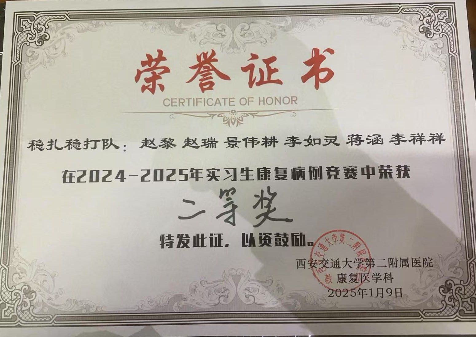 在西安交通大学第二附属医院康复医学科康复治疗学专业实习生病例竞赛中,来自学院2021级康复治疗学1班的实习生景伟耕同学带领团队成员稳扎稳打,以其出色的临床案例展示--“一例丘脑出血患者的康复长跑记”,荣获竞赛二等奖。这一成果展示了团队扎实的专业知识和实践技能,也体现了团队高效协作精神和临床医学综合素养。