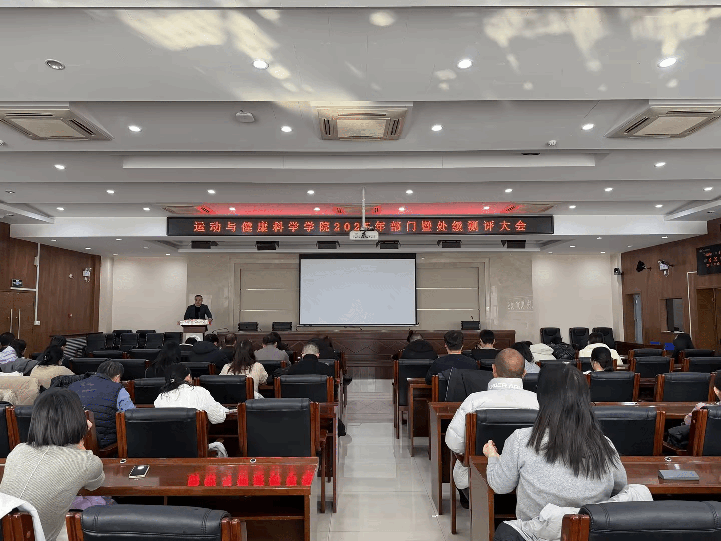 2026年1月5日下午,运动与健康科学学院于二号行政楼六楼报告厅召开2025年度部门暨处级干部民主测评大会。学院领导班子及全体教师参加会议。会议由学院党委书记张鹏华主持。