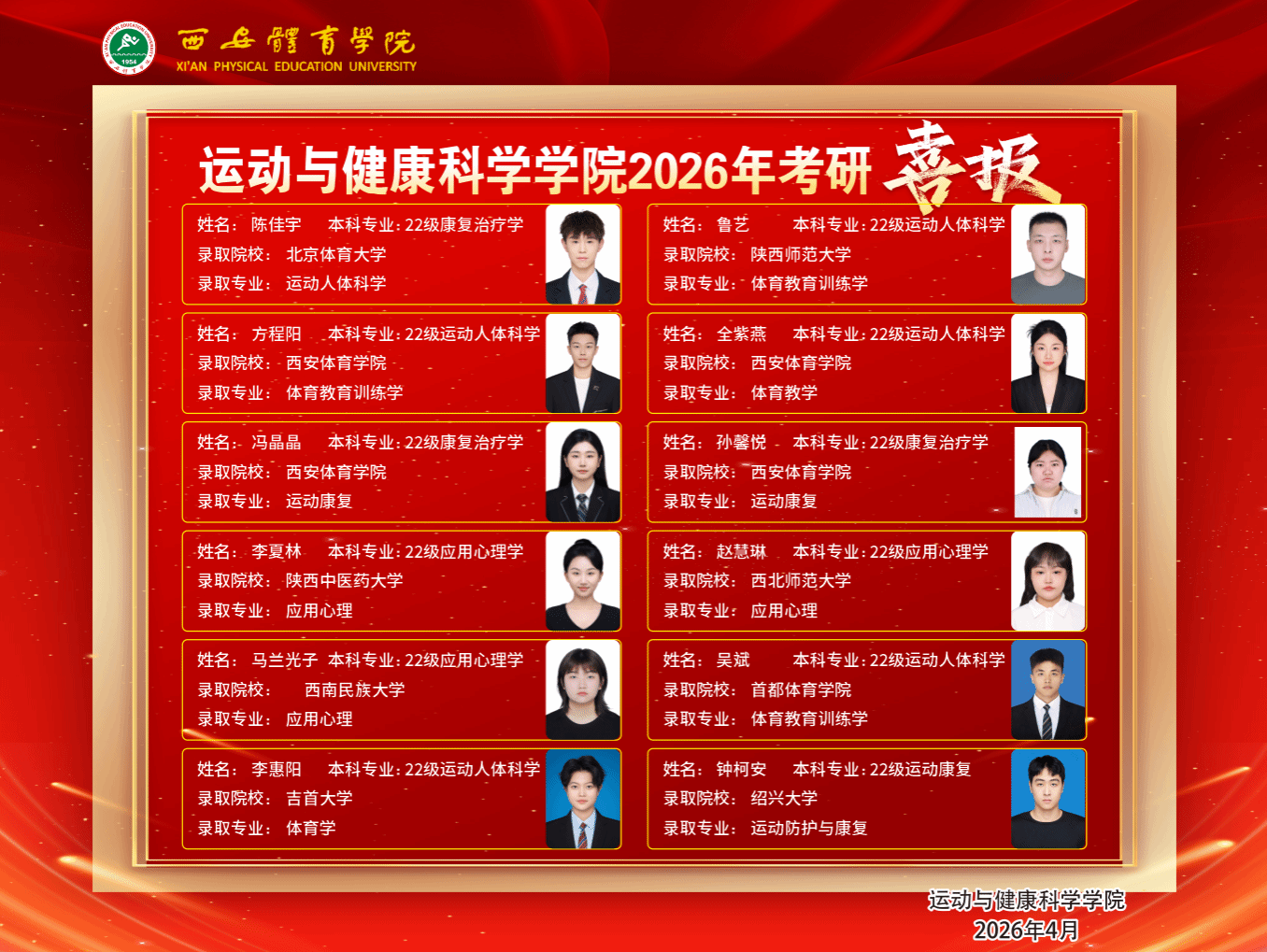四月芳菲,捷报频传。在2026年全国硕士研究生招生录取工作中,运动与健康科学学院喜获佳绩:全院共有14名学子初试上线,最终12人被省内外多所重点院校正式录取。相比去年,升学人数与质量双双跃上新台阶,为学院“十五五”发展赢得了精彩开局。