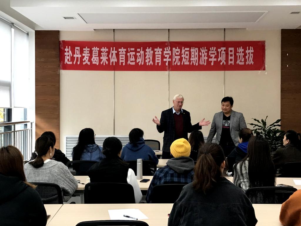 会谈结束后,Finn Berggre先生和中国办事处负责人高志鹏先生对我校报名参加葛莱体育运动教育学院短期研修的学生进行了选拔考试。