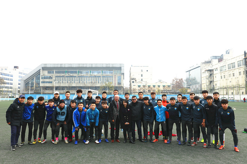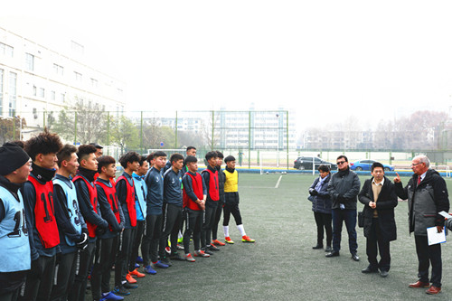 座谈结束后,由朱军、马俊陪同,捷中教育交流协会及国际足联代表一行观摩了我校的足球实训课程情况并对学生进行简要指导。