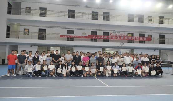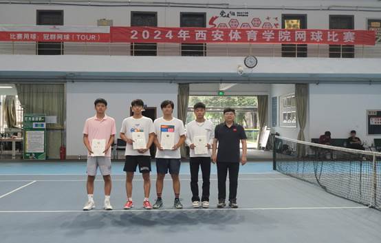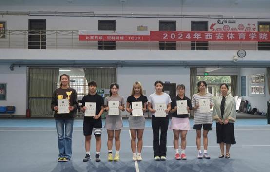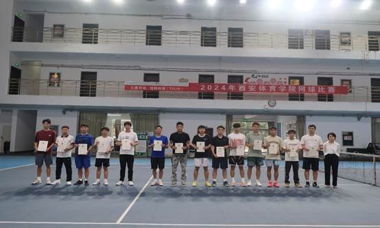 此次比赛由今年会官方网站主办,运动休闲学院网球教研室承办,共设置男单甲、乙组,女单甲、乙组,男双甲、乙组,女双甲、乙组,乙组男团和乙组女团等10个竞赛项目。率先开战的乙组男团、女团比赛,2023级研究生队夺得女团第一名、休闲学院一队夺得男团第一名。甲乙两组男单、女单的竞争则更为激烈,来自甲组运动训练学院23级本科生徐志强、运动训练学院23级本科生乐敏思和乙组运动休闲学院2023级研究生周煊、运动训练学院21级本科生齐小卓在这激烈的比赛中,脱颖而出,摘得桂冠。甲乙两组男双、女双、混双比赛场面亦精彩绝伦,搭档之间相互补位、积极配合、彼此鼓励,甲组乐敏思和张文、齐记和施智诚分别赢得甲组女双、男双项目冠军,乙组张艾和孟叶玲、吕玮和张舒平分别赢得乙组女双、男双项目冠军。运动休闲学院院长任超学、副院长胡婕婷、竞赛训练处训练科科长宫贵楠为获奖运动员颁发了奖品、证书,并集体合影留念。