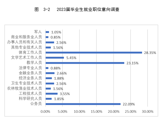 在就业职位意向的选择上,学生意向较高的是“体育工作人员”(28.35%);“教学人员”(23.15%);“公务员”(22.09%)等。
