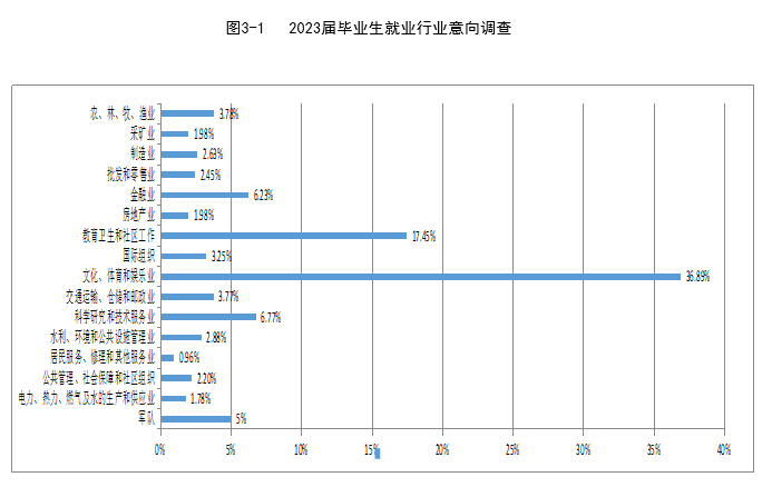 在2023届毕业生就业意向与期待调查问卷中,学生意向较高的行业是“文化、体育和娱乐业”(36.89%)和“教育、卫生和社区工作”(17.45%)。