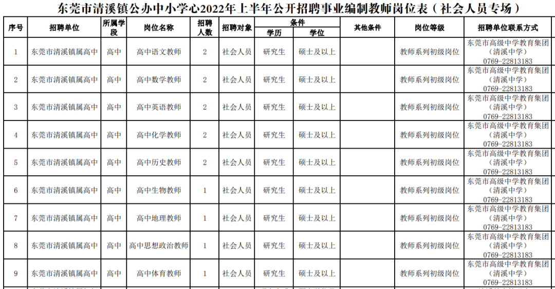 东莞高级中学集团清溪中学(高中部)目前办学规模为12个教学班,在校学生600人。由于扩班教学需要,现学校面向社会诚聘14名优秀教师,被录用者纳入公办学校事业单位人员编制,工资福利待遇由市财政统发。详细的招聘方案以东莞市教育局招聘公告为准,请关注东莞市教育局公众号“东莞慧教育”查阅。