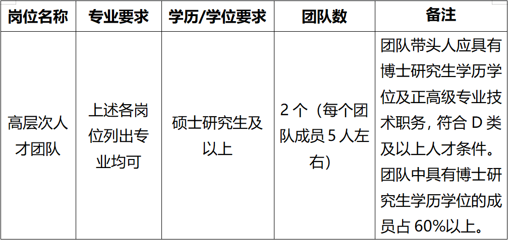 A、B、C、D、E1、E2类共设 9 个岗位,计划引进20人;F类(博士研究生)共设10个岗位,计划引进78人;人才团队计划引进2个;具体岗位需求及条件如下: