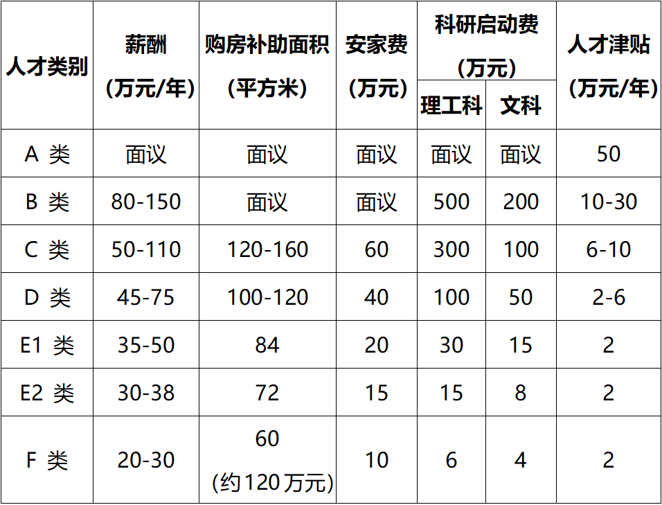 (2)学校为高层次人才免费提供人才公寓或青年教师公寓,使用期限2年。若遇公寓紧缺,则提供2年的租房补贴,AB类人才根据需要据实报销,C类人才3000元/月,D类人才2500元/月,E类人才2000元/月,F类人才1500元/月。