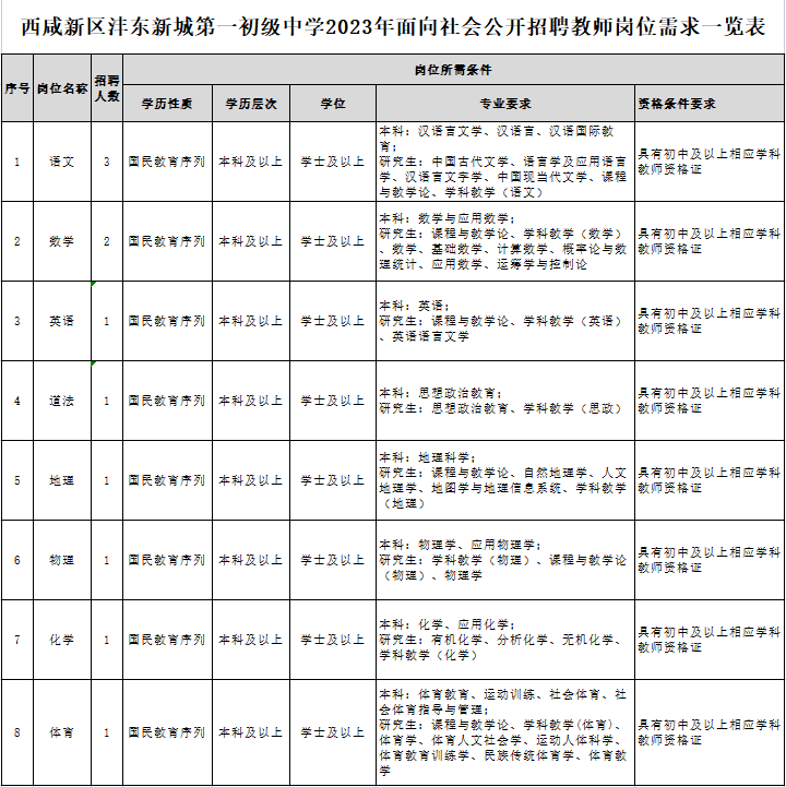 招聘岗位所需的具体条件以附件《西咸新区沣东新城第一初级中学2023年面向社会公开招聘教师岗位需求一览表》的要求为准。