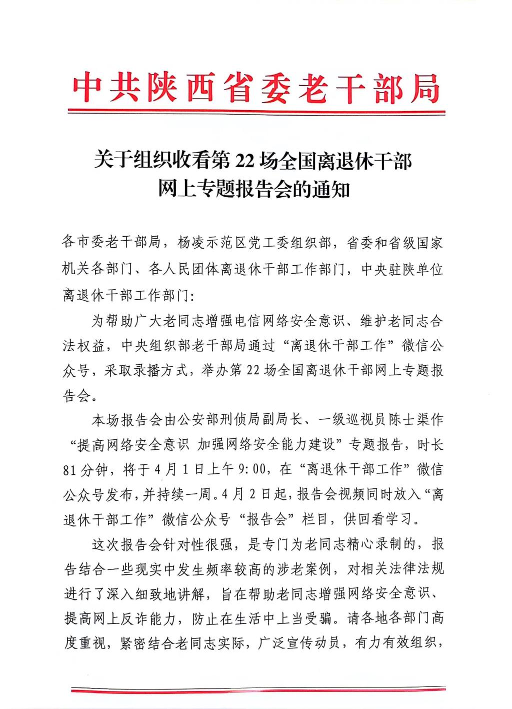 为帮助广大老同志增强电信网络安全意识、维护老同志合法权益,中央组织部老干部局通过“离退休干部工作”微信公众号,采取录播方式,举办第22场全国离退休干部网上专题报告会。报告会将于4月1日(星期一)上午9:00,在“离退休干部工作”微信公众号发布,并持续一周。4月2日起,报告会视频同时放入“离退休干部工作”微信公众号“报告会”栏目,供回看学习。 本场报告会由公安部刑侦局副局长、一级巡视员陈士渠作“提高网络安全意识 加强网络安全能力建设”专题报告,时长81分钟。