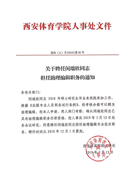 关于聘任闵瑞欣同志担任助理编辑职务的通知