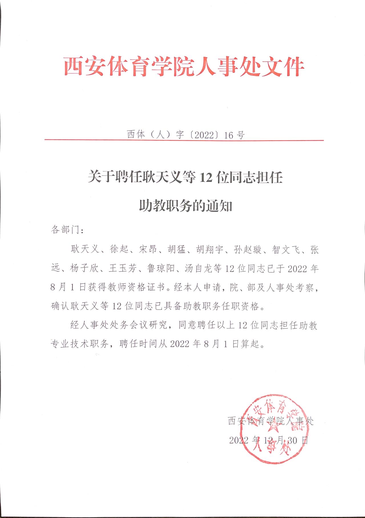 关于聘任耿天义等12位同志担任助教职务的通知