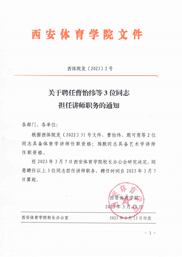 关于聘任曹怡纬等3位同志担任讲师职务的通知