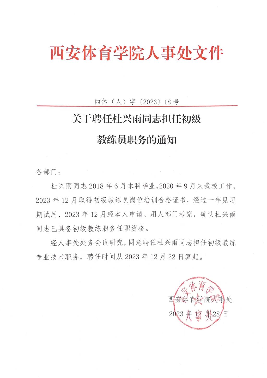 关于聘任杜兴雨同志担任初级教练员职务的通知