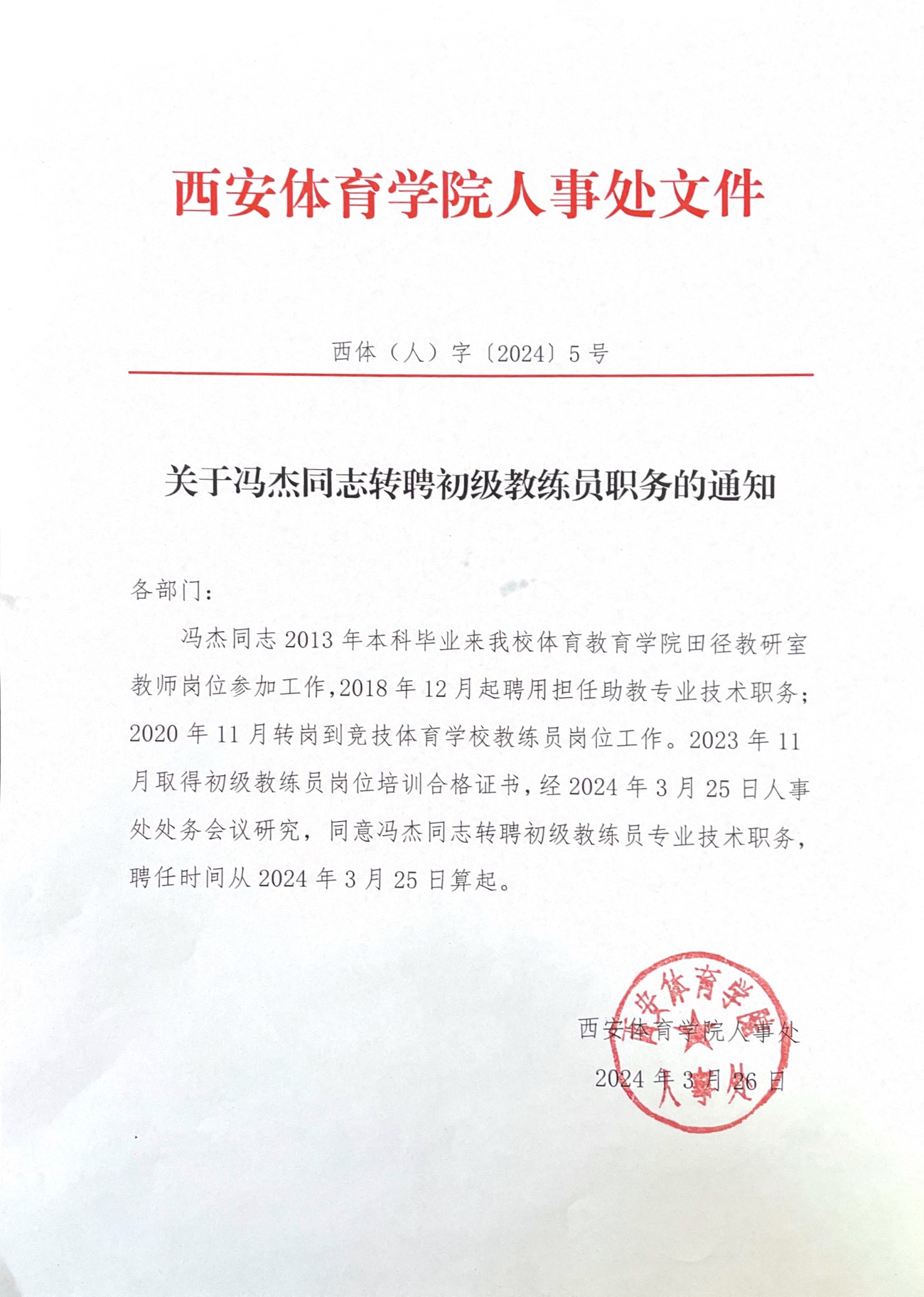 关于冯杰同志转聘初级教练员职务的通知