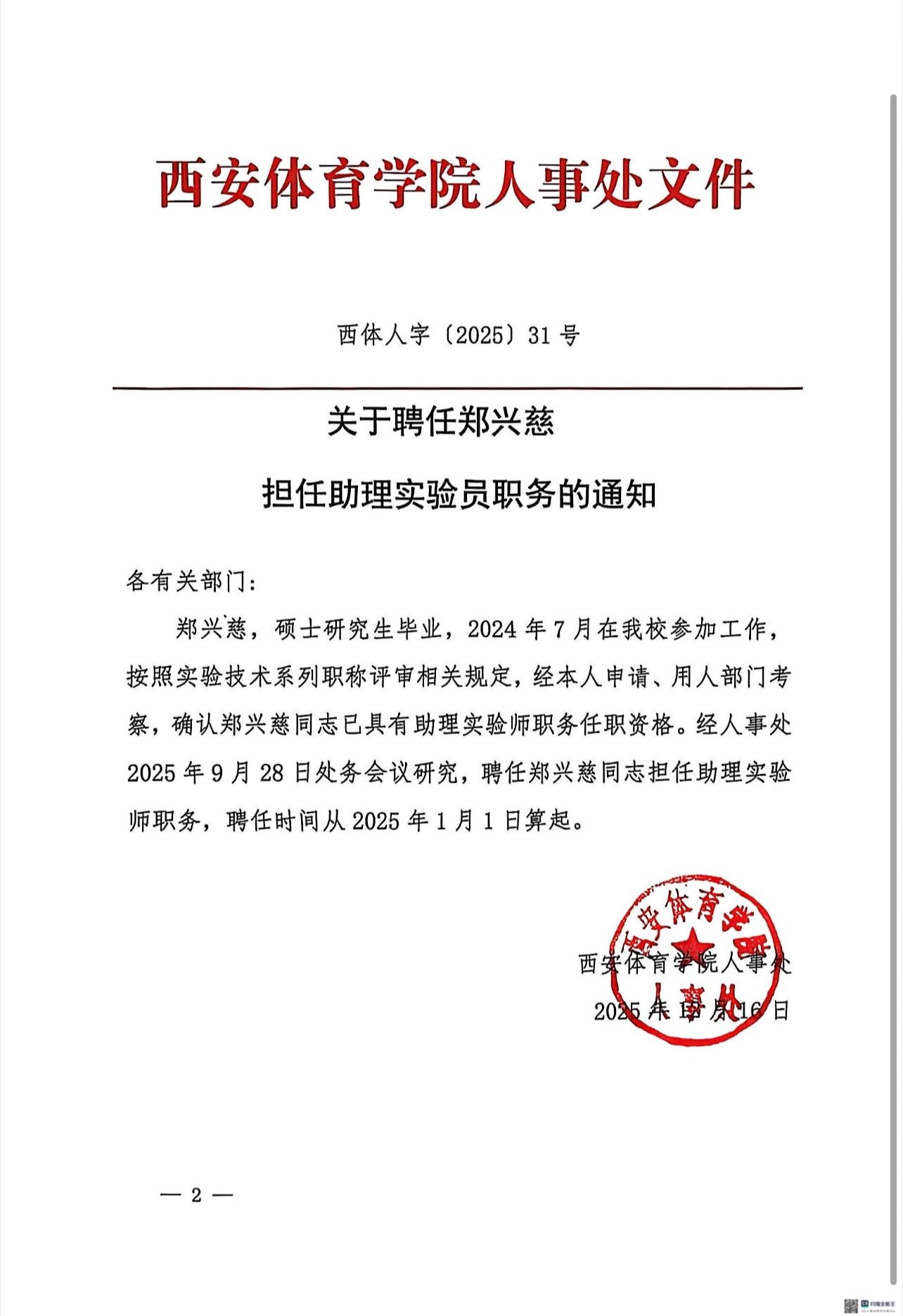 关于聘任李帅帅、郑兴慈担任助理实验员职务的通知