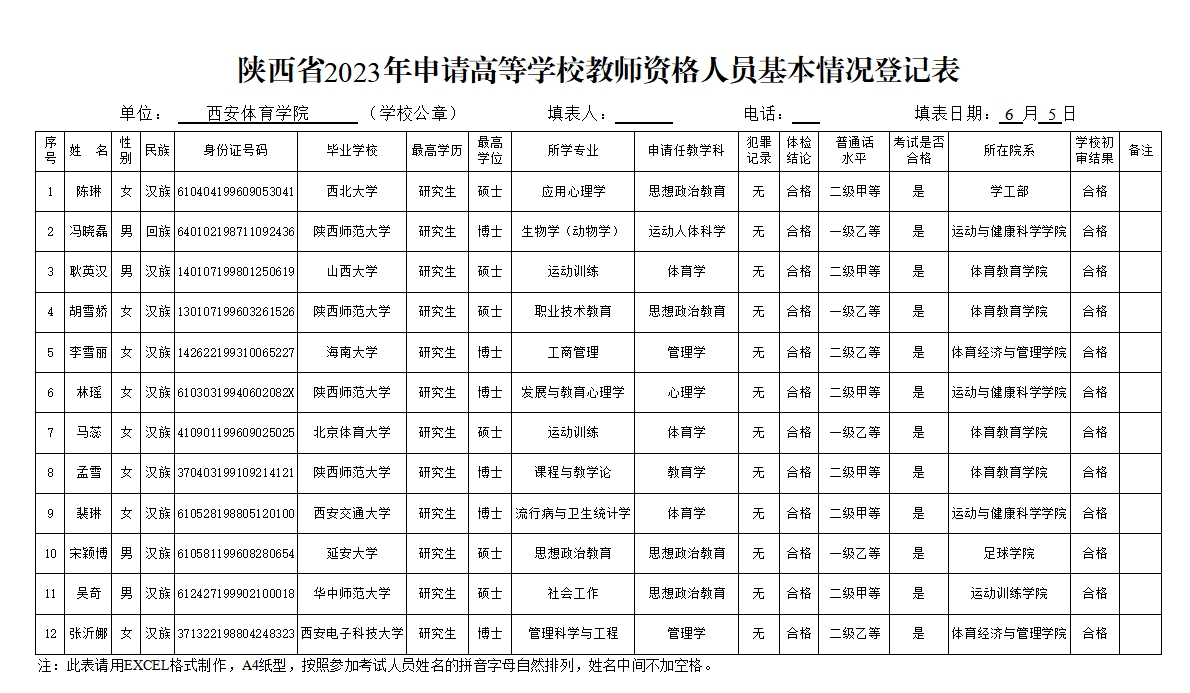 根据《陕西省教育厅办公室 关于做好 2023 年全省高等学校教师资格 专业技能考试与认定工作的通知》(陕教师办〔2023〕15 号)要求,现将我校参加2022年教师资格教育基础理论知识考试合格,符合陕西省2023年申请高等学校教师资格人员基本情况予以公示,公示期5个工作日,如有异议,请于2023年6月21日前向人事处或校纪检监察部门客观如实地反映公示对象的情况。