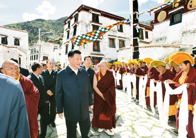 2021年7月21日至23日,中共中央总书记、国家主席、中央军委主席习近平来到西藏,祝贺西藏和平解放70周年,看望慰问西藏各族干部群众。这是22日下午,习近平在位于拉萨西郊的哲蚌寺考察。 新华社记者 谢环驰/摄
