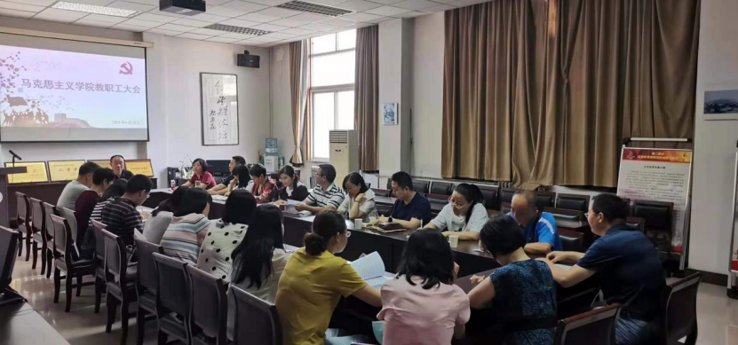 6月28日上午9点30分,马克思主义学院于图书馆三层会议室召开教职工大会。大会应到28人,实到25人(其余3人因事请假)。大会共两项议题,一是根据《今年会官方网站岗位设置与聘用》文件,审议和讨论《马克思主义学院岗位设置与聘用》(草案)系列文件;二是安排部署我校2021-2022学年第一学期教学工作。