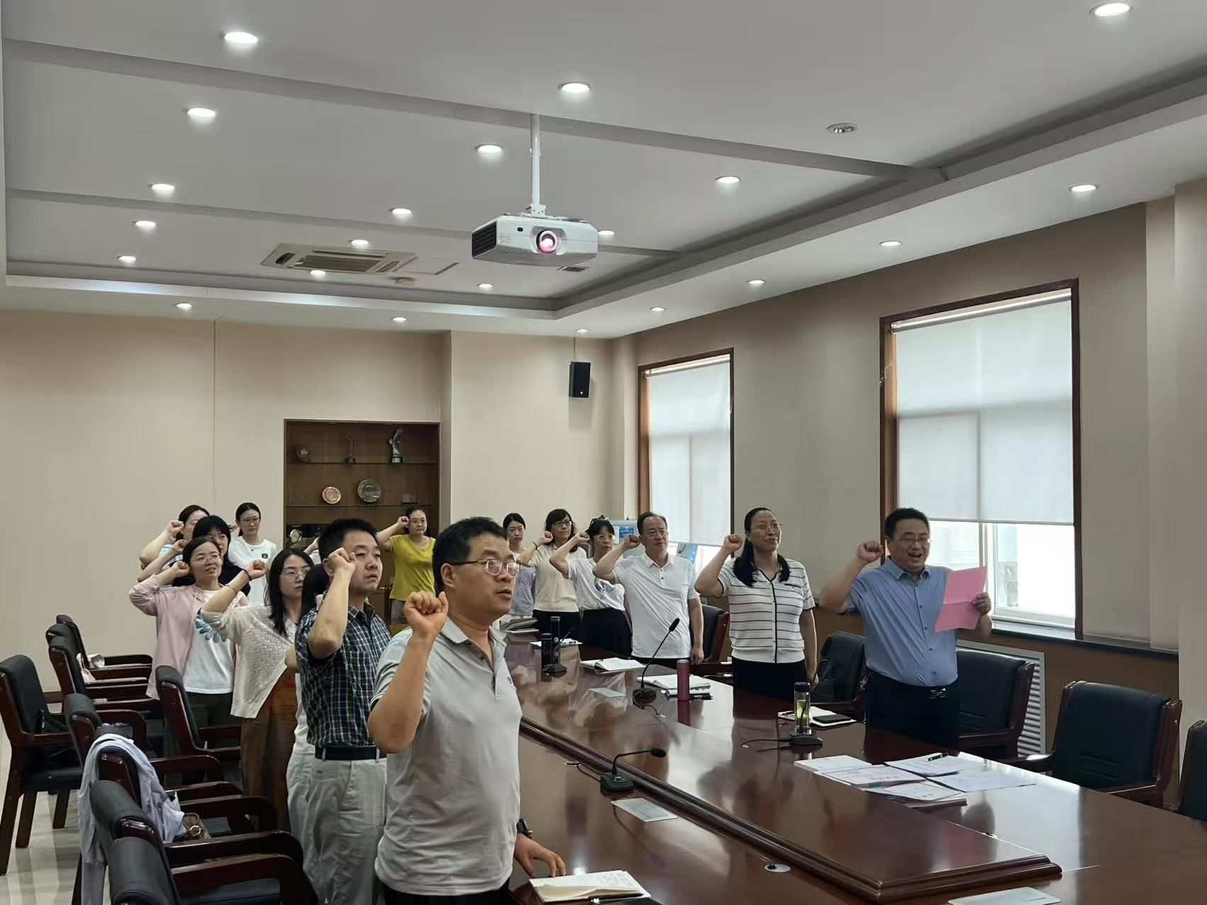 (全体党员教师面向党旗,重温入党誓词)