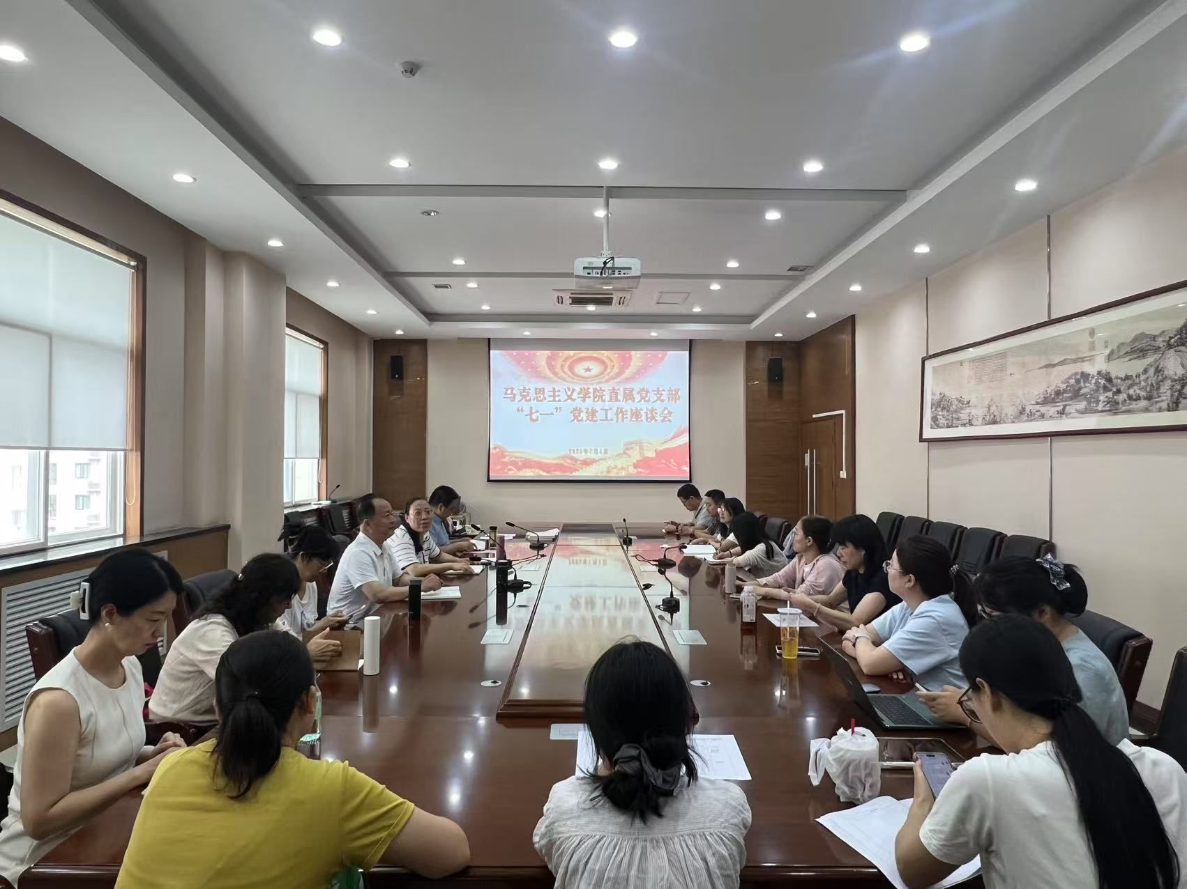 为庆祝中国共产党成立104周年,深入学习贯彻习近平新时代中国特色社会主义思想,进一步加强学院党建工作,提升二级党组织的凝聚力和战斗力,马克思主义学院于7月1日下午在含光校区2号行政楼1号会议室隆重召开庆“七一”党建工作座谈会。学院领导班子成员和全体党员教师齐聚一堂,共庆党的生日,共话党建发展。