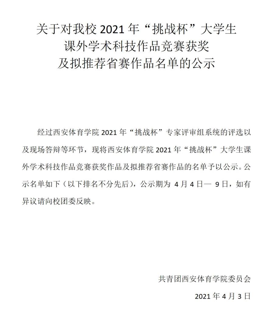 关于对我校2021年“挑战杯”大学生 课外学术科技作品竞赛获奖及拟推荐省赛作品名单的公示