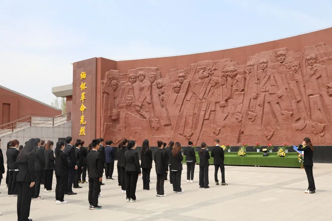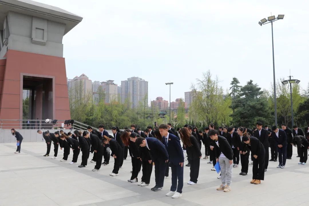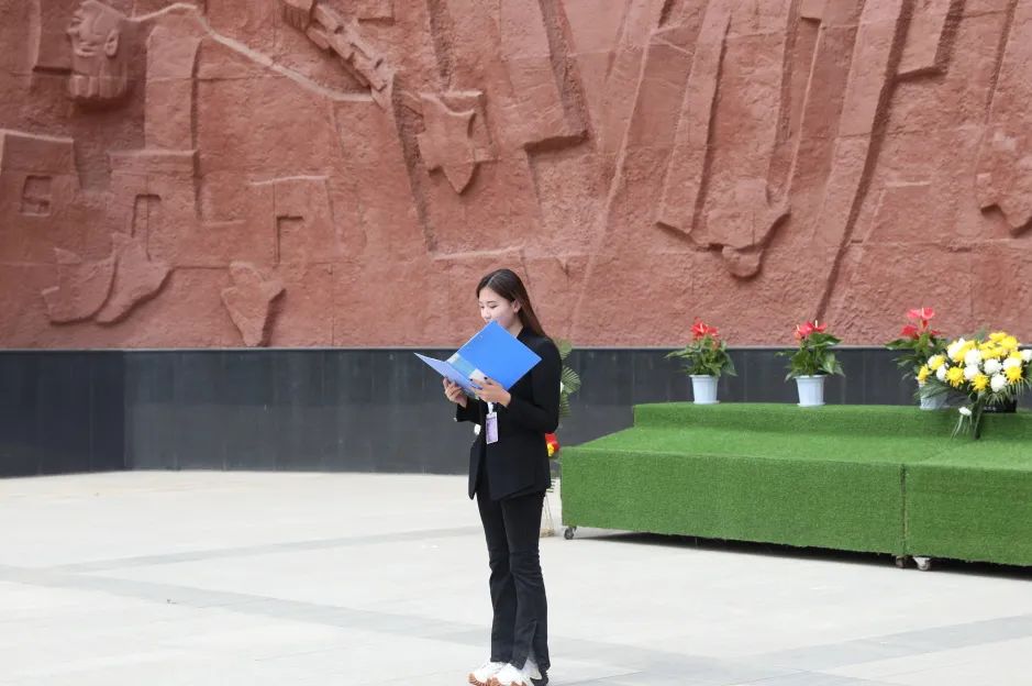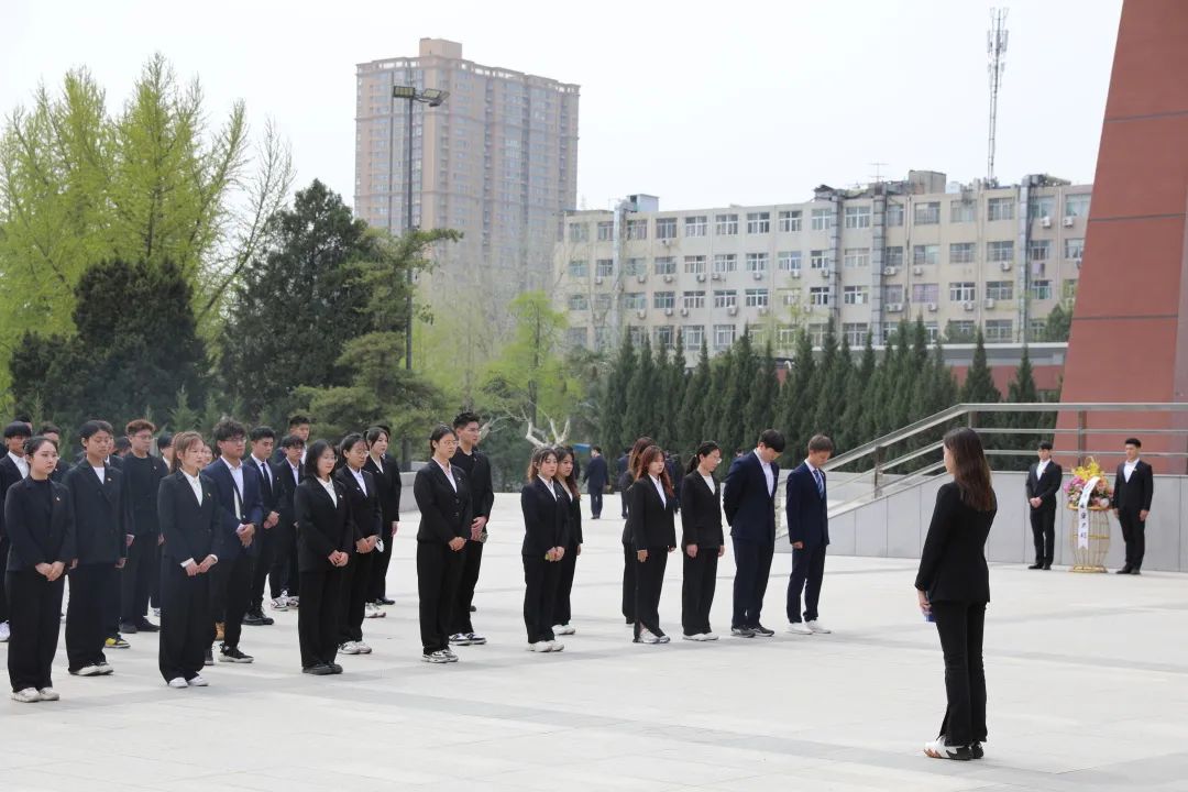 由校学生会秘书处干事牛柯予带领全体同学面向英烈浮雕肃立,默哀三分钟。