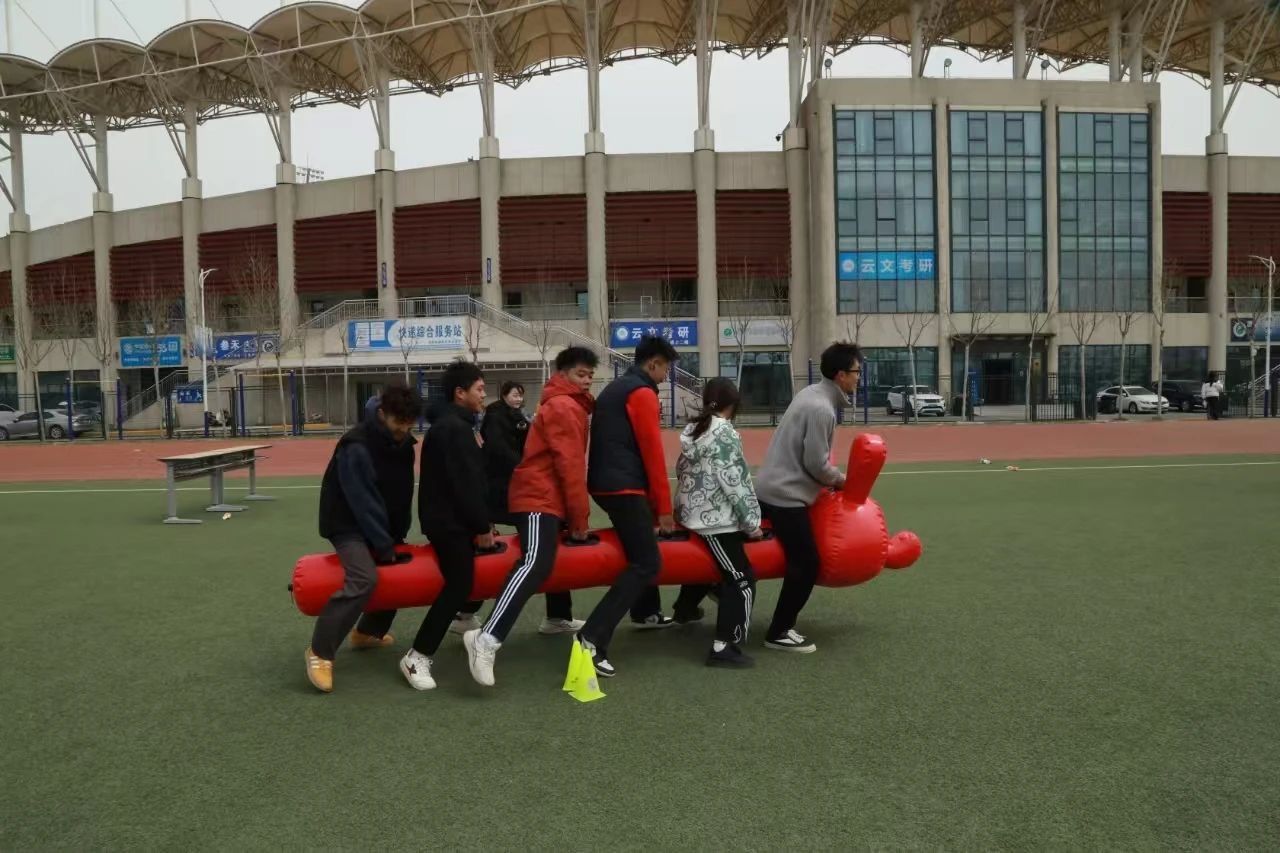 “毛毛虫竞赛”现场,气氛紧张热烈。各队成员紧密配合,喊着整齐划一的口号,齐心协力驱动着“毛毛虫”充气道具在跑道上飞速前行。途中,哪怕有队员不小心踉跄,大家也迅速调整,重新出发,真正诠释了团队协作的力量,展现出坚韧不拔的精神。