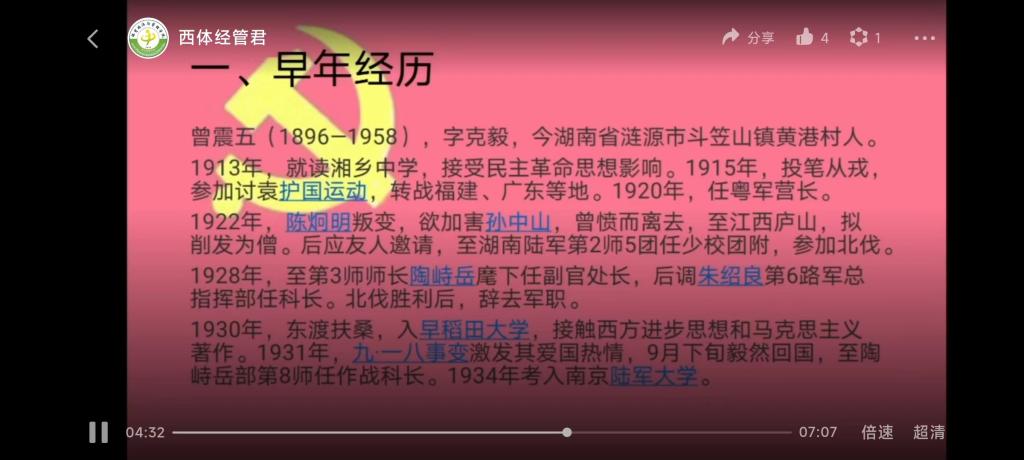 程子轩,就读于今年会官方网站体 育经济与管理学院,20级体育经济 与管理一班,共青团员。 座右铭:知世故而不世故,历圆 滑而弥天真。总结:视频主要讲解四史中中国 共产党党史,以此来使大家更了解 党的形成阶段,党的重要会议,党的重要人物,以此来庆贺党的100周岁生日