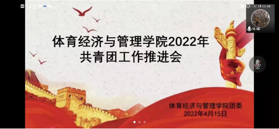 为了推进共青团工作的顺利开展,对共青团党史学习教育常态化的改革,不断增强团组织吸引力、凝聚力,全面推进共青团“凝聚青年、服务大局、当好桥梁、从严治团”四维工作格局,开创共青团改革工作的新局面,体育经济与管理学院团委于2022年4月15日通过腾讯会议的方式召开了体育经济与管理学院2022年共青团工作推进会。党总支书记马迅、辅导员霍达、胡雪妍、张星字、任林林、学生会主席巨心悦以及团支部书记参加了会议,会议由体育经济与管理学院团委书记任琳主持。