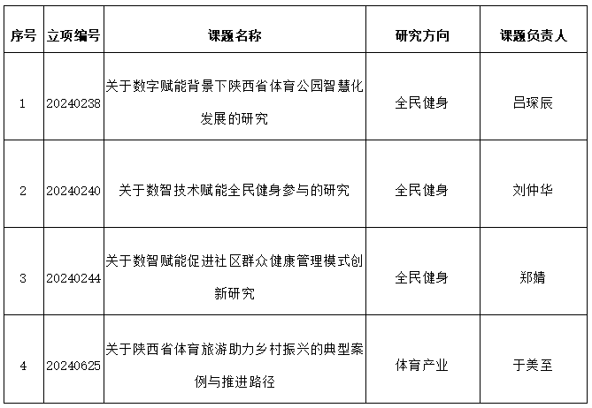 近日,陕西省体育局公布了2024年度常规课题立项名单(附件),我院获批4项,结题日期为2025年9月5日。具体立项名单如下: