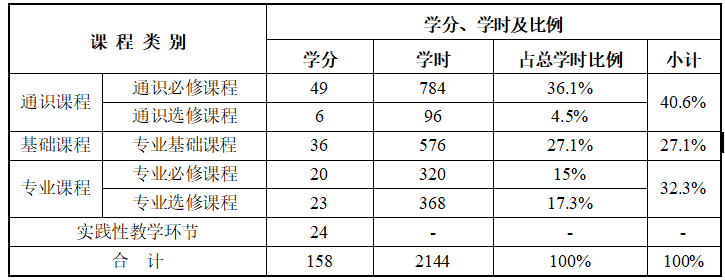 本专业课程结构由必修课程(通识必修课程、专业基础课程、专业课程)和选修课程及实践性教学环节构成。其课程结构、教学周数与学分分配分别见表3、表4。