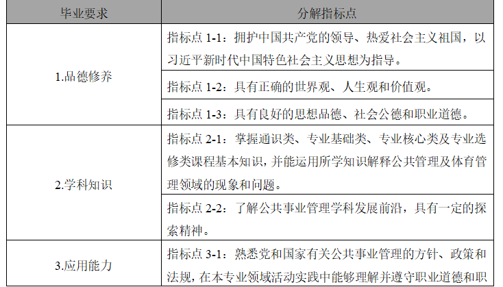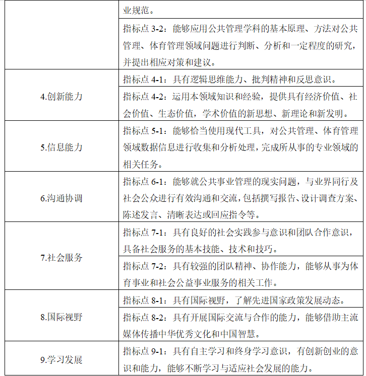 目标3:培养具有能够应用公共管理学科的基本原理、方法对公共管理、体育管理领域问题进行判断、分析和一定程度的研究,并提出相应对策和建议创造性复合型人才。