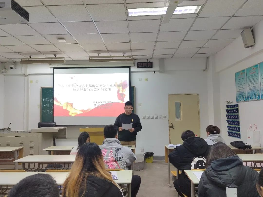 在党成立100周年的重要历史时刻,在“两个一百年”奋斗目标的历史交汇点,为坚持和发展中国特色社会主义的政治宣言,发出新时代中国共产党人牢记初心使命,体育经济与管理学院学生党支部于2021年12月6日下午19:00在教学楼207教室开展“学习《中共中央关于党的百年奋斗重大成就和历史经验的决议》的说明”主题党课活动,参加此次活动的成员有霍达同志、胡雪妍同志、任琳同志以及学生党支部全体同志。