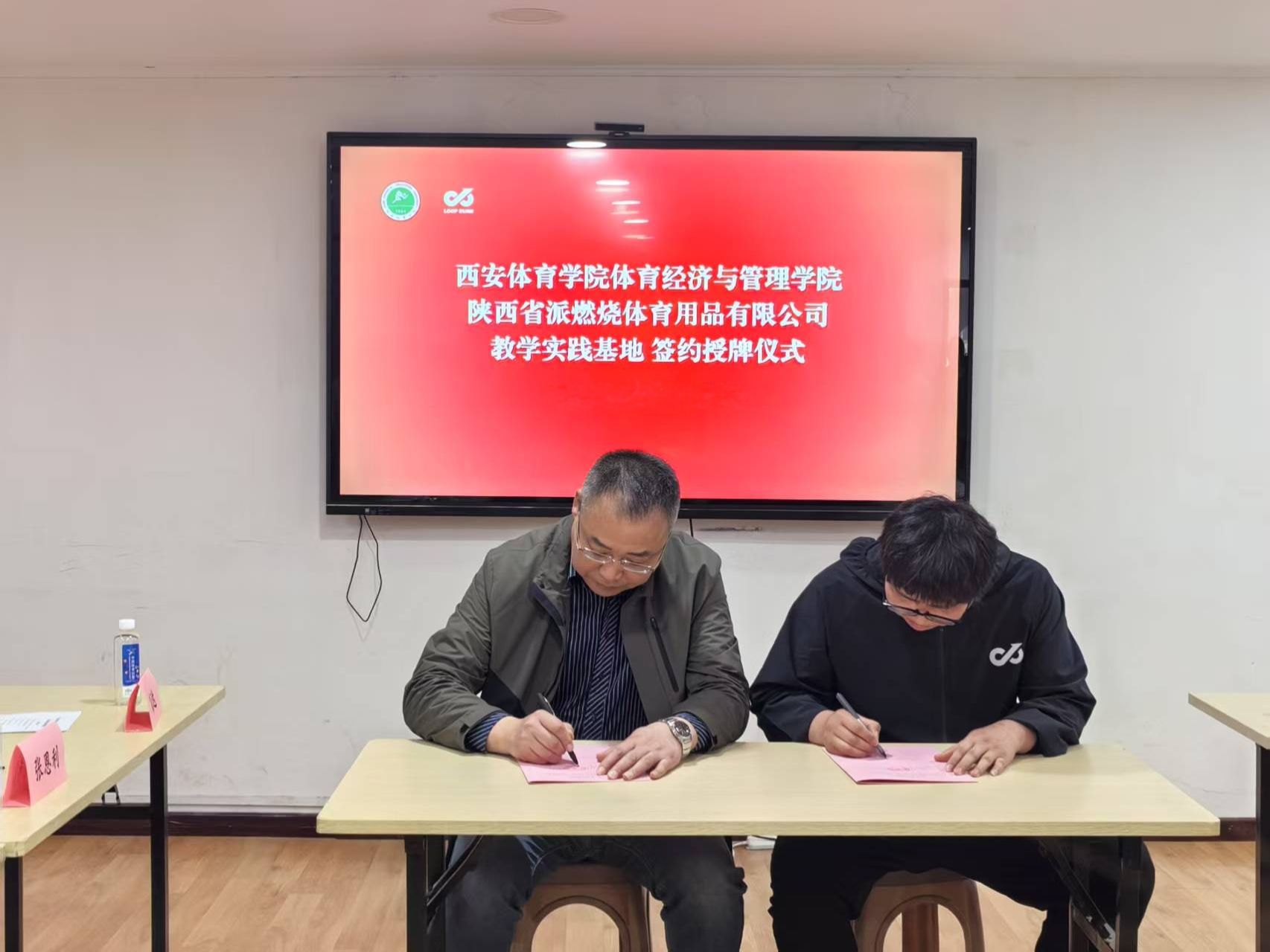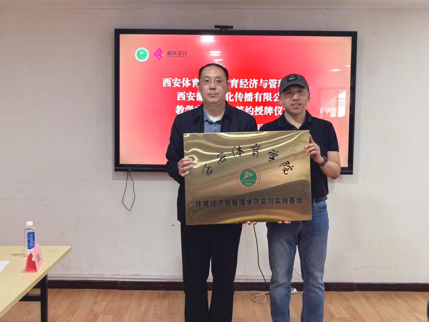 座谈会最后,体育经济与管理学院与西安韶华文化传播有限公司、陕西省派燃烧体育用品有限公司分别签署《教学实践基地共建协议》,并举行授牌仪式。