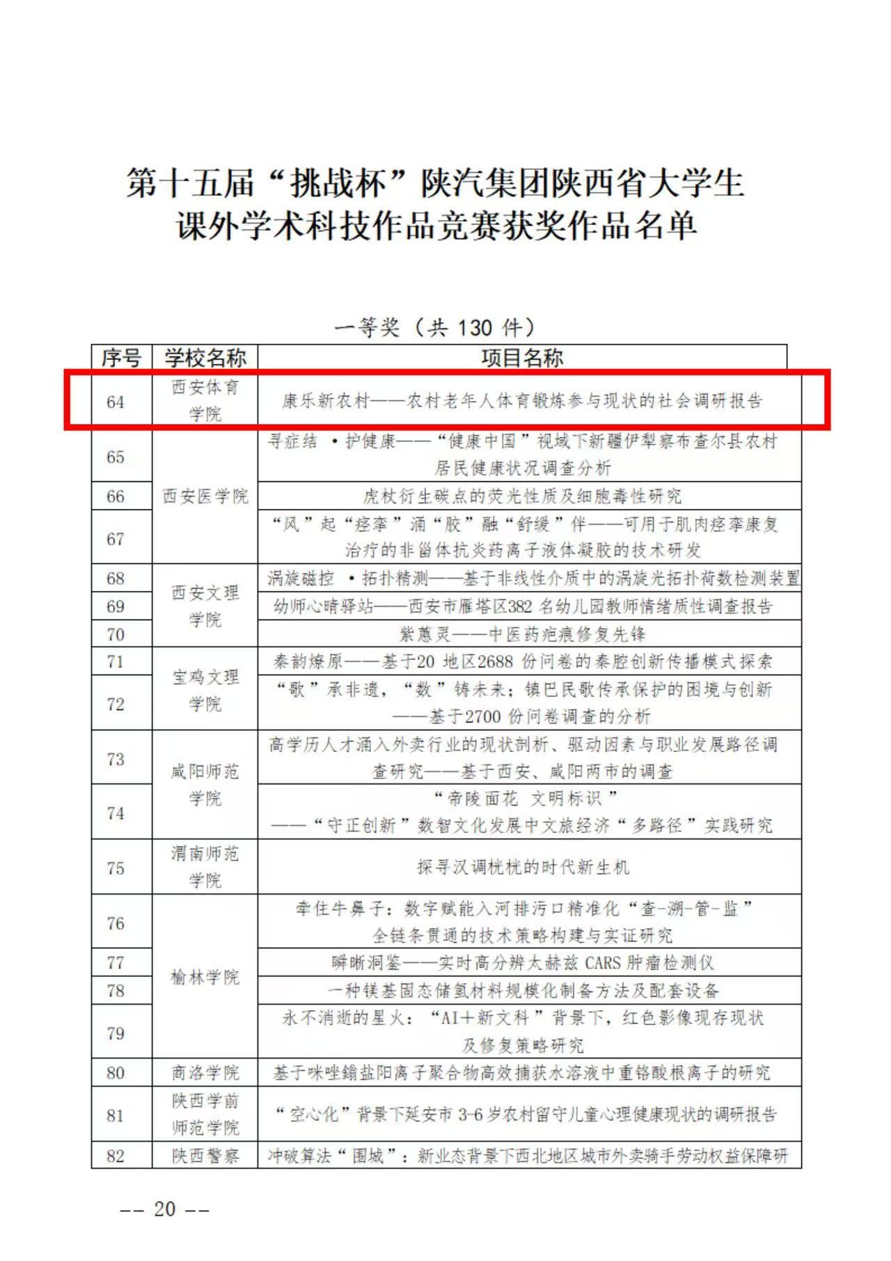 学院高度重视此次竞赛,自去年11月起,便正式启动校级竞赛相关工作。通过学院初赛、校级初审、复赛及终审决赛等层层选拔,精心挑选出优秀项目参与省赛。期间,学院还开展了竞赛宣讲、申报培训、专题辅导以及赛前打磨等一系列活动,为参赛学生提供全方位指导与支持,营造浓厚的科技创新氛围。在激烈的角逐中,体育经济与管理学院学子凭借扎实的专业知识和创新思维脱颖而出。其中,《康乐新农村——农村老年人体育锻炼参与现状的社会调研报告》荣获一等奖,另有4项作品获得三等奖。这些获奖作品紧密围绕体育领域热点问题,兼具学术价值与实践意义,充分展现了学院学生在学术科研和创新实践方面的能力。此次获奖是体育经济与管理学院在学术科技竞赛领域的重要突破。