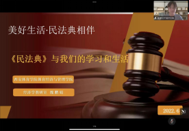 为深入推进民法典学习宣传工作,进一步提高我院师生的法治意识,营造尊法、学法、守法、用法的浓厚氛围,6月7日,我院组织举办了“美好生活·民法典相伴”主题讲座活动。讲座由学工办主任任琳老师主持,特邀经管学院魏鹏娟教授做了题为“民法典与我们的生活与学习”的学术讲座。全院师生参加了活动。讲座开始前,任琳老师对魏老师的研究领域以及学术成就等进行介绍,并对魏老师的到来表示欢迎和感谢。