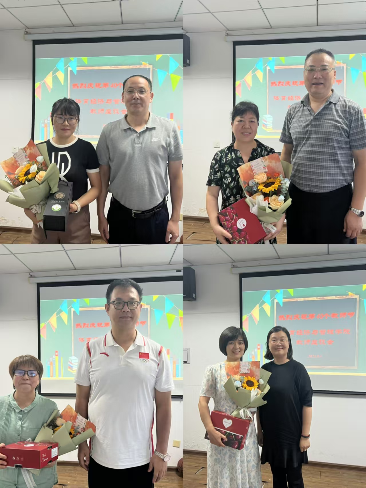 魏鹏娟、穆晓、王芳三位教师代表在座谈会上总结分享了自己多年的教学经验。为表彰先进,激励后进,陈鑫书记、张恩利副院长、丁建岚副院长为魏鹏娟、穆晓、王芳三位老师颁发教师节慰问品、花束;同时,王鹏院长亲自为新入职教师——骆海燕老师佩戴上校徽,并赠予寓意美好的花束,以示欢迎与鼓励。