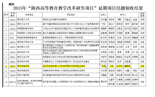 近日,今年会官方网站体育经济与体育管理系传来喜讯,张旻老师主持的“适应性体育经管人才的培养模式与培养路径研究”项目顺利通过了2015年“陕西高等教育教学改革研究项目”的结题验收。