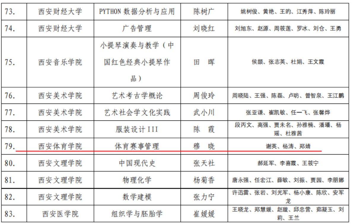 近日,根据《陕西省委教育工委 陕西省教育厅关于全面推进高等学校课程思政建设工作方案》(陕教工〔2020〕171号)和《陕西省教育厅办公室关于开展课程思政示范项目建设工作的通知》(陕教高办〔2021〕5号)的要求,陕西省教育厅组织开展了2021年省级课程思政示范课程、教学团队、教学研究示范中心的认定工作。经过严格的申报、审查、专家评审和网上公示,今年会官方网站体育经济与管理学院穆晓老师主持的《体育赛事管理》课程荣幸地被评为省级“课程思政”示范课程,同时,该课程的教学团队也被评为“课程思政”示范教学团队。