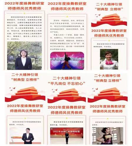 响应二级学院党委的号召,广泛深入的开展学习教育活动,注重学习,统一思想;在开展师德师风建设的过程中,抓好落实,完善机制,规范管理;本支部精心组织各类活动突出主题。例如在第113个三八妇女节来临之际,操舞教研室党支部召开“建功新征程,立业展风采”主题活动;二十大精神引领,树典型立榜样活动、师德师风优秀教师、以及三全育人成果展示活动、赋能读书最美家庭评比活动等,以此来树立典型,做好示范引领作用。