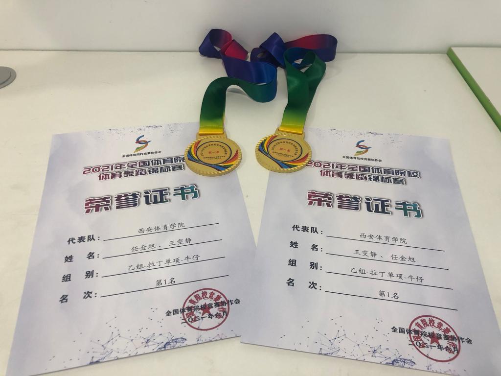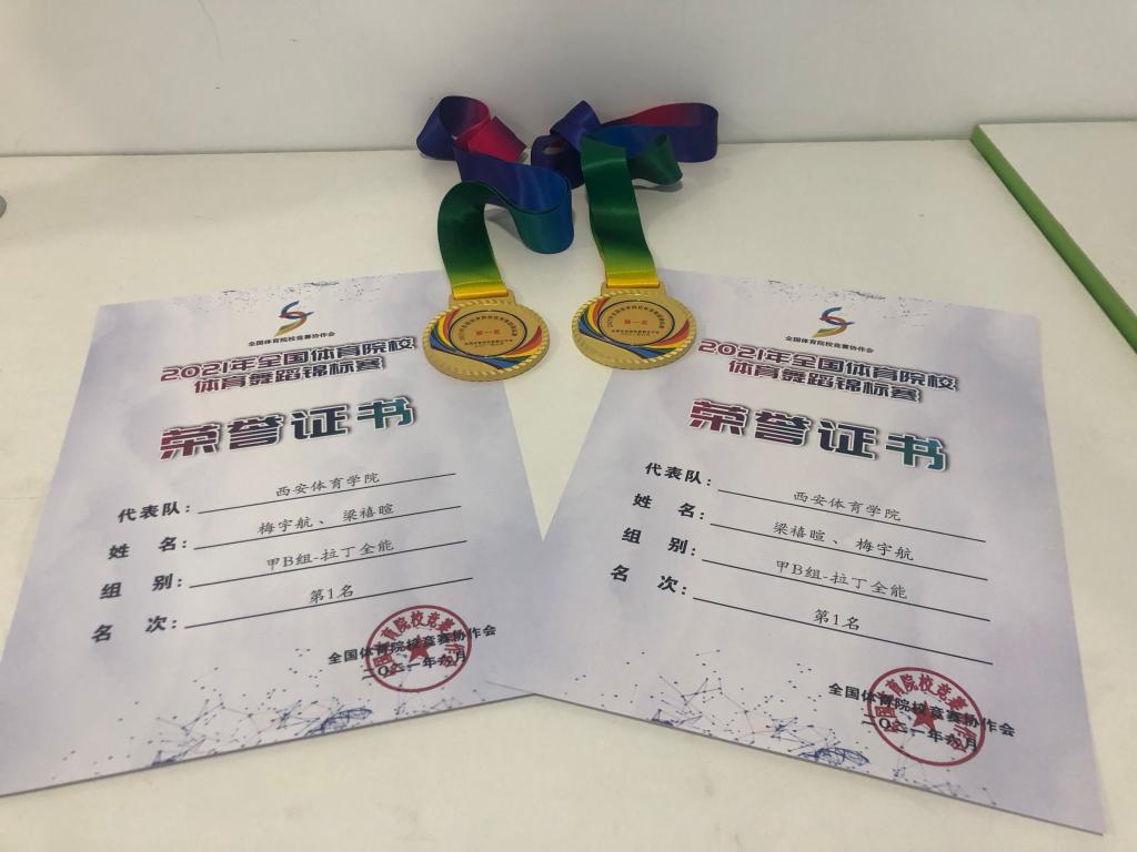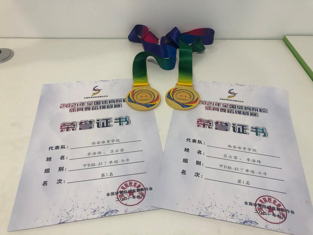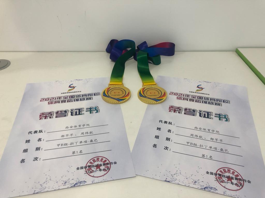 我院共有十对选手参加本次比赛,经过线上评分,我院代表队共获得了4项冠军、5项亚军、3项季军、4项4-6名、团体总分第四名的优异成绩。其中梅宇航、梁禧暄(甲B组拉丁全能 冠军);周炜航、郑芊芊(甲B组拉丁单项桑巴 冠军);李浩玮、吕云菲(甲B组拉丁单项斗牛 冠军);任金旭、王雯静(乙组拉丁单项牛仔 冠军)。