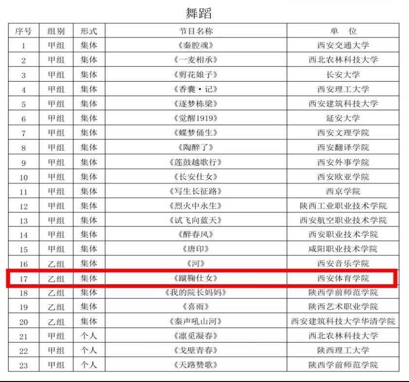 2023年11月9日-11日由陕西省教育厅举办的“陕西省第七届大学生艺术展演”活动在西安建筑科技大学如期举行,本届大学生艺术展演活动主题是:厚植家国情怀,涵养进取品格。展演活动的项目和内容要紧紧围绕主题,展现当代大学生与时代同向,与祖国同行,胸怀家国,奋力筑梦的价值追求;展现当代大学生有理想、敢担当、能吃苦、肯奋斗的精神状态;展现当代大学生心灵美、形象美、行为美、语言美的崇高审美追求和高尚人格修养。我院原创节目《蹴鞠仕女》通过专家初评,冲出重围进入终评。这次展演最终确定声乐节目31个、器乐节目8个、舞蹈节目23个、戏剧节目9个、朗诵节目15个,共有86个节目参加现场展演。
