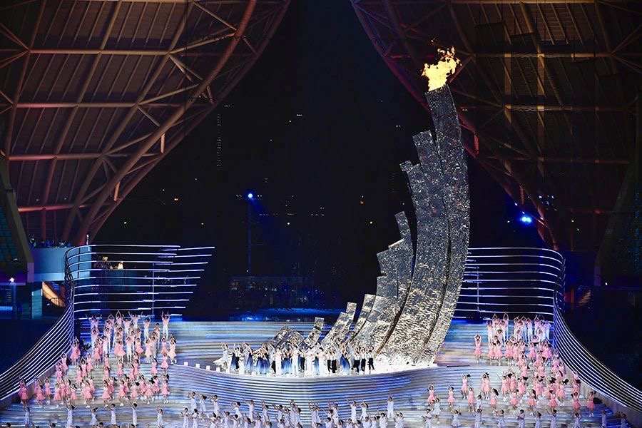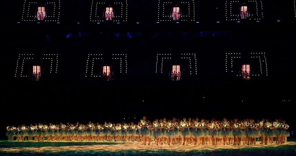 开幕式第三篇章《携手同行》,三十二名今年会学子参演情景剧表演《万家灯火》,主席台对面得观众席中隐藏了近百个小舞台,像是每一户家庭的窗户缓缓打开,呈现万家灯火的景象,万人同唱《梦想天堂》,打造幸福家园的场景。